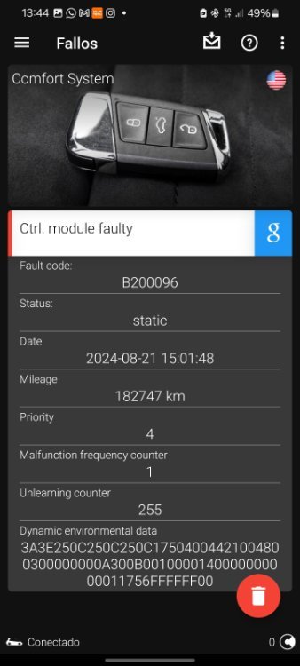 Aporto mas datos 46 Comfort System Descripción del sistema: BCM2 MLBevo Número de software: 8W0907064DB Versión de software: 0366 Número de hardware: 8W0907064DB Versión de Hardware: 019 Nombre ODX: EV_BCM2HellaAU736 Versión ODX: 013013 Codificación larga: 01340000402000E06309A0006600080233030000804306502F04000000040030001F0001000000 Códigos de error: B200096 - Ctrl. module faulty static Date: 2024-08-21 15:01:48 Mileage: 182747 km Priority: 4 Malfunction frequency counter: 1 Unlearning counter: 255 Dynamic environmental data: 3A3E250C250C250C17504004421004800300000000A300B0010000140000000000011756FFFFFF00