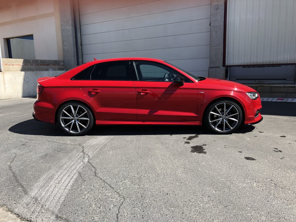 Ya tengo montados mis Pro Kit con la suspensión deportiva. Os dejo un par de fotos del antes y el después. He llevado el coche al mismo sitio y con el depósito lleno en ambas. He intentado hacer la foto desde la misma altura y a la misma distancia, pero eso ya es muy aproximado. El kit que he montado yo para el 1.4 TFSI sedan es el E10-15-021-05-22. Tomando medidas del centro de rueda a la aleta ha bajado: Delantera: Distancia original 36,3 cm a 34,3 cm Trasera: Diatancia original 35,2 cm a 33,5 cm Es decir, que a falta de que asiente un poco porque lleva dos dias puesta, delante ha bajado 2 cm clavados y detrás 1,7 cm. Como podéis ver en las fotos, justo entre medias he cambiado de llantas, pero ambas son 19x8” -