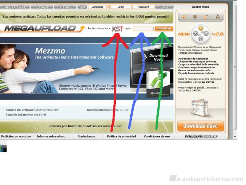 turbo s2 Publicado 20 de Enero del 2009 Denunciar Publicado 20 de Enero del 2009 porfavor alguien m puede explicar como puedo ver el video gracias de antemano RESPUESTA : Tienes que poner las tres letras ( MIRA DIBUJO FLECHA ROJA ) DENTRO DEL CUADRADO ( FLECHA AZUL ) En El cuadrado ( MIRA FLECHA AZUL ) Por ultimo Aprietas donde la flecha de color ( VERDE ) después saldrán 2 formas de descargas , una para socios y otra forma Gratis tienes que pinchar en gratis y esperar 30 minutos a que se descargue SALUDOS A TODOS ( Rafa ) Responder