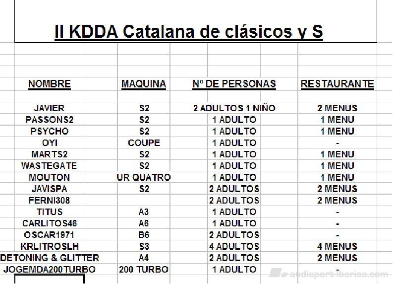 JAVI74 Publicado 7 de Noviembre del 2009 Autor Denunciar Publicado 7 de Noviembre del 2009 Hola amigos, El dia se acerca, ya va siendo hora de concertar la hora H, el dia de la KDDA os facilitare la ruta por escrito en caso de perdida, hoy despues de comer yo ire personalmente a hacer la ruta para ver como esta el tema. Por otra parte os pongo como esta la lista de asistencia, el martes como muy tardar el miercoles, llamare al restaurante para cerrar la reserva. Un saludo