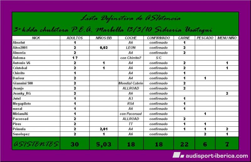 Antonio V6 Publicado 17 de Febrero del 2010 Denunciar Publicado 17 de Febrero del 2010 (editado) el proximo sabado 13 de Marzo tendrá lugar la III Chuletada en la Sidreria Usategui de Marbella organizada por los integrantes del PEA Málaga aqui teneis un pequeño mapa para los que nunca hayáis venido, pincha debajo de la foto y lo veras mas claro web sidreria usategui el menú seguramente mañana lo ponga Aitor2001 que se ha encargado de pedir un MENU ANTI-CRISIS lo unico IRRENUNCIABLE será el chuleton , del resto de acompañamientos ya nos lo pondrá Aitor solo espero poder ver de nuevo al mayor numero de amigos juntos alrededor de una mesa y eso solo se consigue con un pelin de esfuerzo de vuestra parte por la tarde y siguiendo la tradicion y para los mas valientes tendremos sesion de bolos en La Cañada, mientras que otros reposaremos la comida tomandonos unas tonicas aliñás ASI que ya sabeis que ese sabado queda RESERVADO en vuestra agenda para reunirse de nuevo con buenos amigos mañana me encargaré de mandar MP a toda mi lista de amigos agregados pero si no me he acordado de mandartelo...SI a TI ................ no te cortes y apuntaté que serás bien recibido pues a la espera de que Aitor nos ponga el menú con el precio nada mas por mi parte OS ESPERO EN MARBELLA EL SABADO 13/3/10 fotos I chuletada de la II han desaparecido las fotos Editado 25 de Febrero del 2010 por Cristobal
