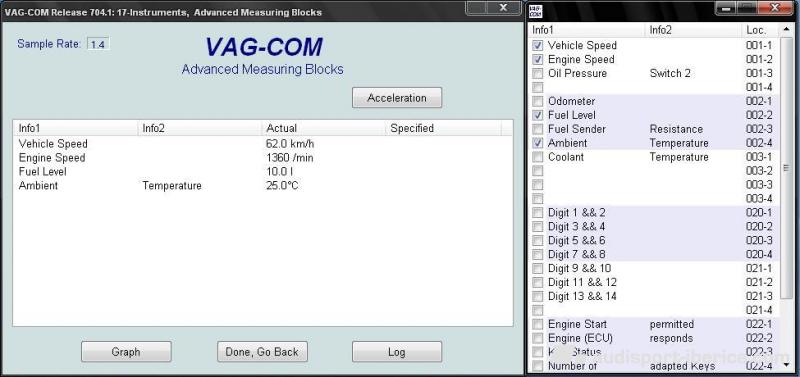 TRACKER_A6 Publicado 22 de Julio del 2010 Denunciar Publicado 22 de Julio del 2010 Hola, pues bien, no hace mucho vi un post muy intersante de como saber los litros que nos quedan en el deposito,velocidad,revoluciones,temperatura del motor,etc..... Y hoy me he decidido a probarlo. los pasos a seguir son los siguientes: 1. Arrancamos el programa y le damos a SELECT 2. Seleccionamos el módulo 17.INSTRUMENTS 3. Seleccionamos la opción Adv. meas. blocks 4. Aparecerán 2 Ventanas, en la ventana de la derecha aparecen varias cosas a escoger, buscais "Tank Content" o "Fuel level" y os aparecerá en la otra ventana los litros que tiene el coche. Responder