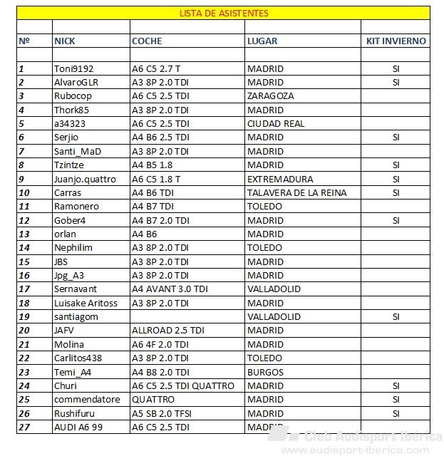 Rushifuru Publicado 19 de Noviembre del 2011 Denunciar Publicado 19 de Noviembre del 2011 ASISTENTES IV QUEDADA NAVIDEÑA PARTICIPANTES____________________________________________________________________KIT DE INVIERNO 1...TONI9192..........................AUDI A6 C5 2.7 T............................MADRID...............................SI 2...ALVARO GLR........................AUDI A3 8P 2.0 TDI..........................MADRID...............................SI 3...Rubocop...........................AUDI A6 C5 2.5 TDI..........................ZARAGOZA 4...Thork85...........................AUDI A3 8P 2.0 TDI..........................MADRID 5...a34323............................AUDI A6 C5 2.5TDI QUATTRO...................VALDEPEÑAS (CIUDAD REAL) 6...Serjio............................AUDI A4 B6 2.5TDI QUATTRO...................MADRID..................................SI 7...Santi_MaD.........................AUDI A3 8P SPORTBACK 2.0 TDI................MADRID 8...Tzintze...........................AUDI A4 B5 1.8..............................MADRID.....................................SI 9...Juanjo.quattro....................AUDI A6 C5 1.8 T QUATTRO....................MERIDA(EXTREMADURA).......................SI 10..Carras.............AUDI A4 B6 TDI QUATTRO .....................TALAVERA OF THE QUEEN (TOLEDO)+DIEGUMBALL PHOTOGRAPHY...........SI 11..Ramonero..........................AUDI A4 B7 TDI S-LINE ......................ILLESCAS (TOLEDO)[/size][/color] 12..Gober4 ...........................AUDI A4 B7 2.0TDI 170 ......................Marbella 2 o COSLADA, Ciudad Sin ley (MADRID)........SI 13..orlan ........................... audi a4 b6 quattro ........................ madrid 14..Nephilim..........................Audi A3 8P SB 2.0 TDI.......................TOLEDO 15..JBS...............................Audi A3 8P SB 1.0 TDI.......................MADRID 16..Jpg_A3............................Audi A3 8P 2.0 TDI..........................MADRID 17..SERNAVANT.........................Audi A4 avant 3.0 TDI.......................VALLADOLID. 18..Luisake Aritoss...................Audi A3 8P .................................MADRID. 19..santiagom.........................Audi ????...................................MEDINA DEL CAMPO (VALLADOLID).......SI 20..JAFV..............................AUDI ALLROAD 2.5 TDI .......................MADRID 21.. Molina...........................Audi A6 4F. 2.0 <TDI........................MADRID / CIUDAD REAL 22.. Carlitos438 ......................... Audi A3 8P 2.0 TDI ................................ ILLESCAS 23.. TEMI_A4 ............................ Audi A4 B8 2.0 TDI ................................ BURGOS 24.. Churi............................Audi A6 C5 2.5 TDI QUATTRO..................MADRID.......................................SI 25.. commendatore.........................Audi A6 C5.........................MADRID........................................SI 26. Rushifuru............................Audi A5 SB 2.0 TFSI .................MADRID........................................SI 27. AUDI A6 99..................... .AUDI A6 C5 2.5 TDI ...............................MADRID 28. Responder