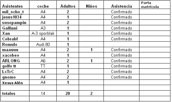 -JOSEMA- Publicado 5 de Octubre del 2006 Denunciar Publicado 5 de Octubre del 2006 Palencia-------------Lalin (450 km. / 4 h. 31') .......50€Habitacion doble------------- Por noche.................76€ Cocidiño-----------------Por persona (25 €)...........50€ Cenas, gastos varios.........................................50€ Estar con vosotros.......................................... ¡¡¡¡¡¡¡¡ No tiene precio!!!!! Confirmaremos la ASIstencia en cuanto podamos. Nosotros dormiriamos en Pontevedra. ¿Como es la carretera de Lalin a Pontevedra por Ocouto, Folgoso, Cachafeiro, Cotoaciveiro, etc.? Que put* envidia me das compañero. los hay con suerte. :clap1: